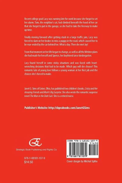 Recent college grad Lacy was running late for work because she forgot to set her alarm. Tom, the neighbor's cat, had climbed beneath the hood of her car that she forgot to put in the garage, so she had to take the freeway to make up time. Finally moving forward after getting stuck in a large traffic jam, Lacy was forced to slam on her brakes to miss a puppy in the road, which caused her to be rear-ended by the car behind her. What a day. Then she met Jay! From that moment on her life began to change, as well as all the lifetime plans she had made for herself and Spence, her boyfriend since kindergarten. Lacy found herself in some sticky situations and was faced with heart-wrenching decisions that had to be made. Which guy will she choose? This romantic tale of young love follows a young woman at her first job and the choices she's forced to make. Janet G. Sims of Eaton, Ohio, has published two children's books, Cristy and Her Amazing Friends and Mark's Big Surprise. She also wrote the romantic suspense novel The Man in the Dark Suit. She is a retired nurse. Publisher's website: http://sbprabooks.com/JanetGSims