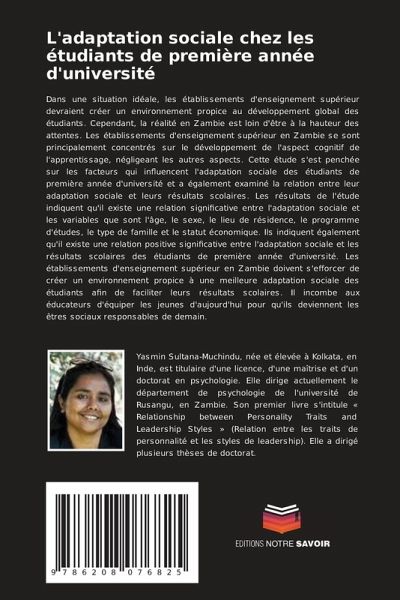 Dans une situation idéale, les établissements d'enseignement supérieur devraient créer un environnement propice au développement global des étudiants. Cependant, la réalité en Zambie est loin d'être à la hauteur des attentes. Les établissements d'enseignement supérieur en Zambie se sont principalement concentrés sur le développement de l'aspect cognitif de l'apprentissage, négligeant les autres aspects. Cette étude s'est penchée sur les facteurs qui influencent l'adaptation sociale des étudiants de première année d'université et a également examiné la relation entre leur adaptation sociale et leurs résultats scolaires. Les résultats de l'étude indiquent qu'il existe une relation significative entre l'adaptation sociale et les variables que sont l'âge, le sexe, le lieu de résidence, le programme d'études, le type de famille et le statut économique. Ils indiquent également qu'il existe une relation positive significative entre l'adaptation sociale et les résultats scolaires des étudiants de première année d'université. Les établissements d'enseignement supérieur en Zambie doivent s'efforcer de créer un environnement propice à une meilleure adaptation sociale des étudiants afin de faciliter leurs résultats scolaires. Il incombe aux éducateurs d'équiper les jeunes d'aujourd'hui pour qu'ils deviennent les êtres sociaux responsables de demain.