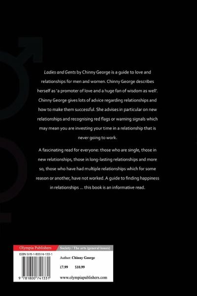 Ladies and Gents by Chinny George is a guide to love and relationships for men and women. Chinny George describes herself as 'a promoter of love and a huge fan of wisdom as well'. Chinny George gives lots of advice regarding relationships and how to make them successful. She advises in particular on new relationships and recognising red flags or warning signals which may mean you are investing your time in a relationship that is never going to work. A fascinating read for everyone: those who are single, those in new relationships, those in long-lasting relationships and more so, those who have had multiple relationships which for some reason or another, have not worked. A guide to finding happiness in relationships ... this book is an informative read.