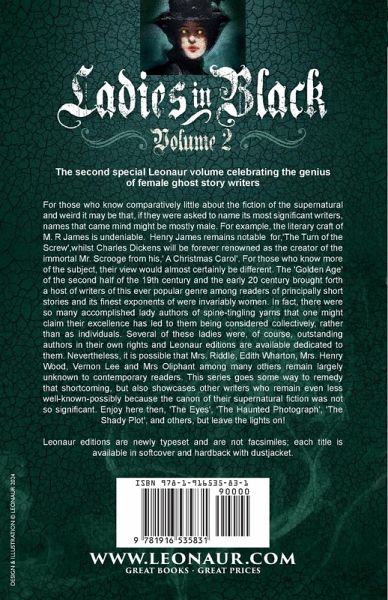 The second special Leonaur volume celebrating the genius of female ghost story writers For those who know comparatively little about the fiction of the supernatural and weird it may be that, if they were asked to name its most significant writers, names that came mind might be mostly male. For example, the literary craft of M. R James is undeniable. Henry James remains notable for,'The Turn of the Screw',whilst Charles Dickens will be forever renowned as the creator of the immortal Mr. Scrooge from his,' A Christmas Carol'. For those who know more of the subject, their view would almost certainly be different. The 'Golden Age' of the second half of the 19th century and the early 20 century brought forth a host of writers of this ever popular genre among readers of principally short stories and its finest exponents of were invariably women. In fact, there were so many accomplished lady authors of spine-tingling yarns that one might claim their excellence has led to them being considered collectively, rather than as individuals. Several of these ladies were, of course, outstanding authors in their own rights and Leonaur editions are available dedicated to them. Nevertheless, it is possible that Mrs. Riddle, Edith Wharton, Mrs. Henry Wood, Vernon Lee and Mrs Oliphant among many others remain largely unknown to contemporary readers. This series goes some way to remedy that shortcoming, but also showcases other writers who remain even less well-known-possibly because the canon of their supernatural fiction was not so significant. Enjoy here then, 'The Eyes', 'The Haunted Photograph', 'The Shady Plot', and others, but leave the lights on! Leonaur editions are newly typeset and are not facsimiles; each title is available in softcover and hardback with dustjacket.