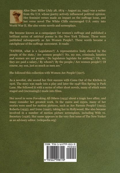 Alice Duer Miller (July 28, 1874 - August 22, 1942) was a writer from the U.S. whose poetry actively influenced political opinion. Her feminist verses made an impact on the suffrage issue, and her verse novel The White Cliffs encouraged U.S. entry into World War II. She also wrote novels and screenplays. She became known as a campaigner for women's suffrage and published a brilliant series of satirical poems in the New York Tribune. These were published subsequently as Are Women People?. These words became a catchphrase of the suffrage movement. It reads: "FATHER, what is a Legislature?/ A representative body elected by the people of the state./ Are women people?/ No, my son, criminals, lunatics and women are not people./ Do legislators legislate for nothing?/ Oh, no; they are paid a salary./ By whom?/ By the people./ Are women people?/ Of course, my son, just as much as men are." She followed this collection with Women Are People! (1917). As a novelist, she scored her first success with Come Out of the Kitchen in 1916. The story was made into a play and later the 1948 film Spring in Park Lane. She followed it with a series of other short novels, many of which were staged and (increasingly) made into films. Her novel in verse Forsaking All Others (1933) about a tragic love affair, and many consider her greatest work. In the 1920s and 1930s, many of her stories were used for motion pictures, such as Are Parents People? (1925), Roberta (1935), and Irene (1940), taking her to Hollywood. She also became involved in a number of motion picture screenplays, including Wife vs. Secretary (1936). Her name appears in the very first issue of The New Yorker as an advisory editor. (wikipedia.org)