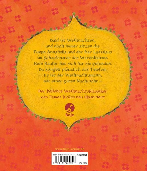 Der beliebte Weihnachtsklassiker von James Krüss neu illustriert: Bald ist Weihnachten, und noch immer sitzen die Puppe Annabella und der Bär Ladislaus im Schaufenster des Warenhauses. Kein Käufer hat sich für sie gefunden. Voller Mitleid lässt der gute alte Mann von der Wach- und Schließgesellschaft in diesem letzten Fenster das Licht an. Da klingelt plötzlich das Telefon. Es ist der Weihnachtsmann, und er braucht dringend eine Puppe und einen Bären. Was für ein Glück. So finden Ladislaus und Annabella doch noch ein neues Zuhause - rechtzeitig zum schönsten Fest des Jahres.