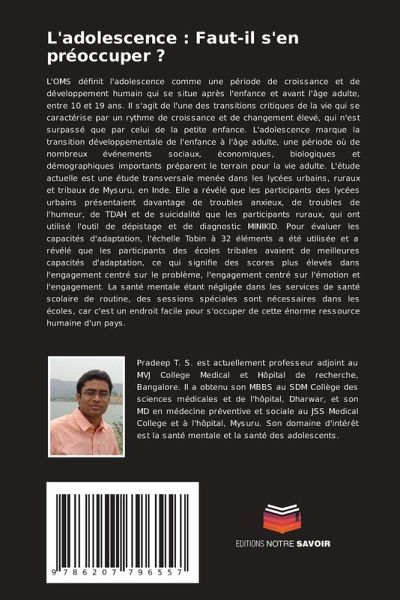 L'OMS définit l'adolescence comme une période de croissance et de développement humain qui se situe après l'enfance et avant l'âge adulte, entre 10 et 19 ans. Il s'agit de l'une des transitions critiques de la vie qui se caractérise par un rythme de croissance et de changement élevé, qui n'est surpassé que par celui de la petite enfance. L'adolescence marque la transition développementale de l'enfance à l'âge adulte, une période où de nombreux événements sociaux, économiques, biologiques et démographiques importants préparent le terrain pour la vie adulte. L'étude actuelle est une étude transversale menée dans les lycées urbains, ruraux et tribaux de Mysuru, en Inde. Elle a révélé que les participants des lycées urbains présentaient davantage de troubles anxieux, de troubles de l'humeur, de TDAH et de suicidalité que les participants ruraux, qui ont utilisé l'outil de dépistage et de diagnostic MINIKID. Pour évaluer les capacités d'adaptation, l'échelle Tobin à 32 éléments a été utilisée et a révélé que les participants des écoles tribales avaient de meilleures capacités d'adaptation, ce qui signifie des scores plus élevés dans l'engagement centré sur le problème, l'engagement centré sur l'émotion et l'engagement. La santé mentale étant négligée dans les services de santé scolaire de routine, des sessions spéciales sont nécessaires dans les écoles, car c'est un endroit facile pour s'occuper de cette énorme ressource humaine d'un pays.