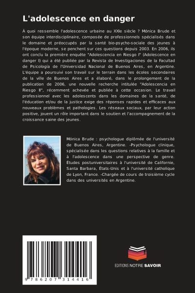 À quoi ressemble l'adolescence urbaine au XXIe siècle ? Mónica Brude et son équipe interdisciplinaire, composée de professionnels spécialisés dans le domaine et préoccupés par la santé bio-psycho-sociale des jeunes à l'époque moderne, se penchent sur ces questions depuis 2003. En 2006, ils ont conclu la première enquête "Adolescencia en Riesgo I" (Adolescence en danger I) qui a été publiée par la Revista de Investigaciones de la Facultad de Psicología de l'Universidad Nacional de Buenos Aires, en Argentine. L'équipe a poursuivi son travail sur le terrain dans les écoles secondaires de la ville de Buenos Aires et a élaboré, dans le prolongement de la publication de 2006, une nouvelle recherche intitulée "Adolescencia en Riesgo II", récemment achevée et publiée à cette occasion. Le travail professionnel avec les adolescents dans les domaines de la santé, de l'éducation et/ou de la justice exige des réponses rapides et efficaces aux nouveaux problèmes et pathologies. Les réseaux sociaux, par leur action positive, jouent un rôle important dans le soutien et l'accompagnement de la croissance saine des jeunes.