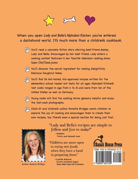 Lady and Bella's Alphabet Kitchen provides first-time cooks with easy-to-follow yummy recipes. The cookbook opens with a fiction story featuring Lady and Bella and a cooking contest with adorable colorable original illustrations that also teaches cooking etiquette and hygiene. Included is a cooking terms glossary and a "Create your own recipes" section. You’ll see a recipe photo gallery with the twenty-six test cooks, ages 4-16, from ten U.S. states and Germany who tried and approved every recipe in the Alphabet Kitchen.