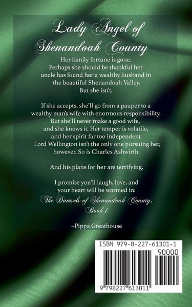 Angel is about to lose everything. Where will she go when the last penny is spent? And what about the household staff who are now dependent on her? They're her only family now. Perhaps she should be grateful her uncle has found a prospective husband for her in beautiful Shenandoah County. But she isn't. If she accepts, she'll be the mistress of a big house with a huge staff and enormous responsibility. Can she do it? And if she refuses, what will become of her? Her fiery temper and independent spirit ensure she won't make a good wife; she's sure of it. Why then does Lord Wellington insist on pursuing her? But she soon finds he isn't the only one pursuing her; so is Charles Ashwirth. And his plans for her are terrifying.