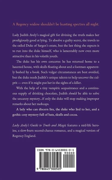 A Regency widow shouldn't be hunting spectres all night. Lady Judith Avely's magical gift for divining the truth makes her prodigiously good at lying. To absolve a guilty secret, she travels to the exiled Duke of Sargen's estate, but the last thing she expects is to run into the duke himself, who is lamentably now even more attractive than in his volatile youth. The duke has his own concerns: he has returned home to a haunted house, with skulls floating about and a footman apparently bashed by a book. Such vulgar circumstances are best avoided, but the duke needs Judith's unique talents to help uncover the culprit - even if it might put her in the sights of a killer. With the help of a tiny vampiric acquaintance and a continuous supply of drinking chocolate, Judith should be able to solve the uncanny mystery...if only the duke will stop making improper remarks about her mobcaps. A lady who can discern lies, the duke who lied to her, and a gothic cosy mystery full of bats, skulls and cocoa. Lady Avely's Guide to Truth and Magic features a mid-life heroine, a slow-burn second-chance romance, and a magical version of Regency England.