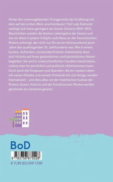 Hinter der namensgebenden Protagonistin der Erzählung mit dem auf den ersten Blick unscheinbaren Titel Lady Balmoral verbirgt sich keine geringere als Queen Victoria (1819-1901). Beschrieben werden die letzten Lebensjahre der Queen und wie sie diese in jedem Frühjahr aufs Neue an der französischen Riviera verbringt, der nicht nur für sie ein Sehnsuchtsort jener Jahre des ausklingenden 19. Jahrhunderts war. Wie in einem bunten, duftenden, sonnenüberfluteten Kaleidoskop lässt sich Victoria auf ihren gedanklichen und tatsächlichen Reisen begleiten. Sie wird in unterschiedlichen Facetten beschrieben, sodass man ihr persönlich und politisch näherkommen kann. Doch auch die Strapazen und Querelen, die ein royales Leben mit seiner Etikette und seinem Protokoll mit sich bringt, werden thematisiert - und dies alles vor der malerischen Kulisse der Riviera. Queen Victoria und der französischen Riviera werden gleichsam ein Denkmal gesetzt.