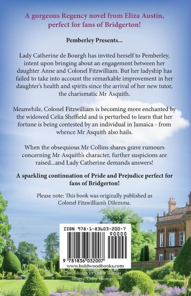 A gorgeous Regency novel from Eliza Austin, perfect for fans of Bridgerton! Pemberley Presents... Lady Catherine de Bourgh has invited herself to Pemberley, intent upon bringing about an engagement between her daughter Anne and Colonel Fitzwilliam. But her ladyship has failed to take into account the remarkable improvement in her daughter's health and spirits since the arrival of her new tutor, the charismatic Mr Asquith. Meanwhile, Colonel Fitzwilliam is becoming more enchanted by the widowed Celia Sheffield and is perturbed to learn that her fortune is being contested by an individual in Jamaica - from whence Mr Asquith also hails. When the obsequious Mr Collins shares grave rumours concerning Mr Asquith's character, further suspicions are raised...and Lady Catherine demands answers! A sparkling continuation of Pride and Prejudice perfect for fans of Bridgerton! Please note: This book was originally published as Colonel Fitzwilliam's Dilemma.