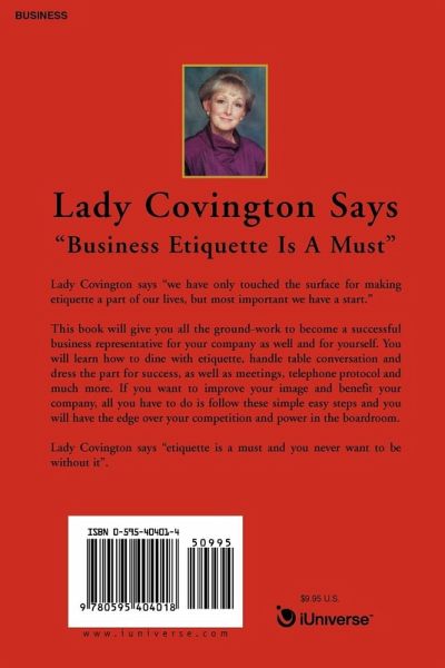 Lady Covington says "we have only touched the surface for making etiquette a part of our lives, but most important we have a start." This book will give you all the ground-work to become a successful business representative for your company as well and for yourself. You will learn how to dine with etiquette, handle table conversation and dress the part for success, as well as meetings, telephone protocol and much more. If you want to improve your image and benefit your company, all you have to do is follow these simple easy steps and you will have the edge over your competition and power in the boardroom. Lady Covington says "etiquette is a must and you never want to be without it".