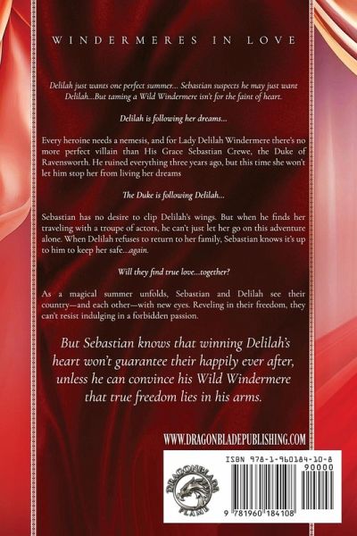 Delilah just wants one perfect summer... Sebastian suspects he may just want Delilah...But taming a Wild Windermere isn't for the faint of heart. Delilah is following her dreams... Every heroine needs a nemesis, and for Lady Delilah Windermere there's no more perfect villain than His Grace Sebastian Crewe, the Duke of Ravensworth. He ruined everything three years ago, but this time she won't let him stop her from living her dreams. The Duke is following Delilah... Sebastian has no desire to clip Delilah's wings. But when he finds her traveling with a troupe of actors, he can't just let her go on this adventure alone. When Delilah refuses to return to her family, Sebastian knows it's up to him to keep her safe...again. Will they find true love...together? As a magical summer unfolds, Sebastian and Delilah see their country-and each other-with new eyes. Reveling in their freedom, they can't resist indulging in a forbidden passion. But Sebastian knows that winning Delilah's heart won't guarantee their happily ever after, unless he can convince his Wild Windermere that true freedom lies in his arms. Windermeres in Love Book 1 - Lady Amelia Takes a Lover Book 2 - Lord Archer Catches a Contessa Book 3 - Miss Windermere Woos a Highlander Book 4 - Lady Delilah Dares a Duke