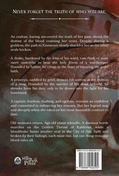 Never forget the truth of who you are. An orphan, having uncovered the truth of her past, shuns the destiny of the blood coursing her veins. Despite slaying a goddess, the path to Eminence slowly shackles her as the other seals beckon. A drake, burdened by the loss of his ward, can think of none more unworthy to bear the holy horns of a wardkeeper. Hounded by failure, he clings to the hope of repaying the gods' faith. A princeps, saddled by grief, drowns his sorrow at the bottom of a mug. Hounded by the specter of his dead beloved, he shrinks from his duty, only to be drawn into the fight for his homeland. A captain, fearless, dashing, and egoless, remains as confident and committed to enhancing her renown. But her legend may end abruptly when she takes on her most damnable contract to date. Old nemeses return. Age-old plans rekindle. A daemon horde marches on the Golden Throne of Kalderim, while a blooddrake hunts another seal in the City of Sin. Split and broken by their failings, each must rise, but one thing remains: blood rules all.