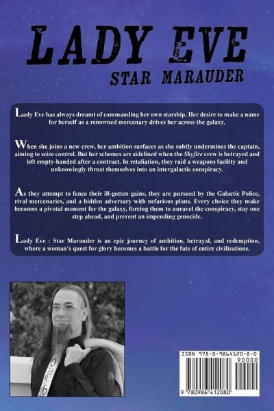 Lady Eve has always dreamt of commanding her own starship. Her desire to make a name for herself as a renowned mercenary drives her across the galaxy. When she joins a new crew, her ambition surfaces as she subtly undermines the captain, aiming to seize control. But her schemes are sidelined when the Skyfire crew is betrayed and left empty-handed after a contract. In retaliation, they raid a weapons facility and unknowingly thrust themselves into an intergalactic conspiracy. As they attempt to fence their ill-gotten gains, they are pursued by the Galactic Police, rival mercenaries, and a hidden adversary with nefarious plans. Every choice they make becomes a pivotal moment for the galaxy, forcing them to unravel the conspiracy, stay one step ahead, and prevent an impending genocide. Lady Eve : Star Marauder is an epic journey of ambition, betrayal, and redemption, where a woman's quest for glory becomes a battle for the fate of entire civilizations.