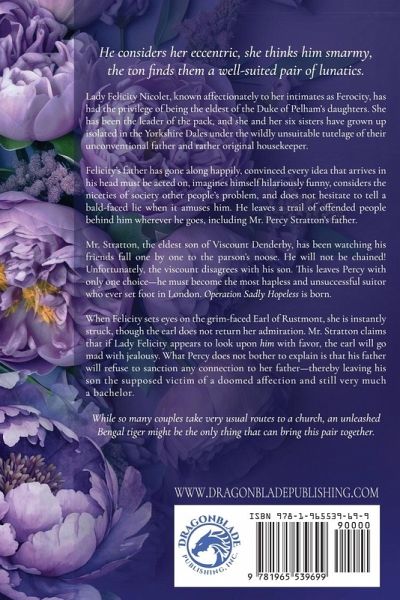 He considers her eccentric, she thinks him smarmy, the ton finds them a well-suited pair of lunatics. Lady Felicity Nicolet, known affectionately to her intimates as Ferocity, has had the privilege of being the eldest of the Duke of Pelham's daughters. She has been the leader of the pack, and she and her six sisters have grown up isolated in the Yorkshire Dales under the wildly unsuitable tutelage of their unconventional father and rather original housekeeper. Felicity's father has gone along happily, convinced every idea that arrives in his head must be acted on, imagines himself hilariously funny, considers the niceties of society other people's problem, and does not hesitate to tell a bald-faced lie when it amuses him. He leaves a trail of offended people behind him wherever he goes, including Mr. Percy Stratton's father. Mr. Stratton, the eldest son of Viscount Denderby, has been watching his friends fall one by one to the parson's noose. He will not be chained! Unfortunately, the viscount disagrees with his son. This leaves Percy with only one choice-he must become the most hapless and unsuccessful suitor who ever set foot in London. Operation Sadly Hopeless is born. When Felicity sets eyes on the grim-faced Earl of Rustmont, she is instantly struck, though the earl does not return her admiration. Mr. Stratton claims that if Lady Felicity appears to look upon him with favor, the earl will go mad with jealousy. What Percy does not bother to explain is that his father will refuse to sanction any connection to her father-thereby leaving his son the supposed victim of a doomed affection and still very much a bachelor. While so many couples take very usual routes to a church, an unleashed Bengal tiger might be the only thing that can bring this pair together. Note: This series is part of Dragonblade's Sweet Dreams line, so this is a sweet, wholesome Historical Romance where passion beyond the bedroom door is left to the reader's imagination.