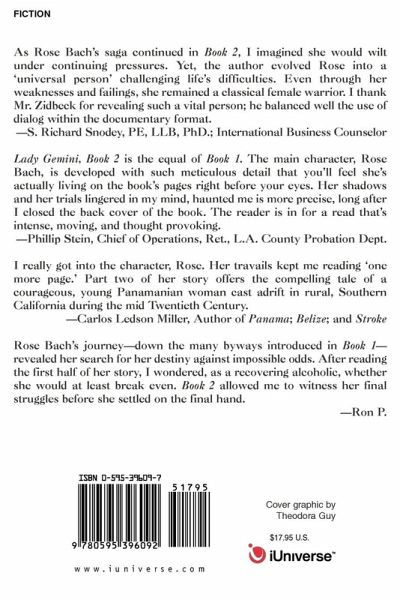 As Rose Bach's saga continued in Book 2, I imagined she would wilt under continuing pressures. Yet, the author evolved Rose into a 'universal person' challenging life's difficulties. Even through her weaknesses and failings, she remained a classical female warrior. I thank Mr. Zidbeck for revealing such a vital person; he balanced well the use of dialog within the documentary format. -S. Richard Snodey, PE, LLB, PhD.; International Business Counselor Lady Gemini, Book 2 is the equal of Book 1. The main character, Rose Bach, is developed with such meticulous detail that you'll feel she's actually living on the book's pages right before your eyes. Her shadows and her trials lingered in my mind, haunted me is more precise, long after I closed the back cover of the book. The reader is in for a read that's intense, moving, and thought provoking. -Phillip Stein, Chief of Operations, Ret., L.A. County Probation Dept. I really got into the character, Rose. Her travails kept me reading 'one more page.' Part two of her story offers the compelling tale of a courageous, young Panamanian woman cast adrift in rural, Southern California during the mid Twentieth Century. -Carlos Ledson Miller, Author of Panama; Belize; and Stroke Rose Bach's journey-down the many byways introduced in Book 1-revealed her search for her destiny against impossible odds. After reading the first half of her story, I wondered, as a recovering alcoholic, whether she would at least break even. Book 2 allowed me to witness her final struggles before she settled on the final hand. -Ron P.