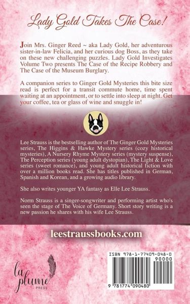 Lady Gold Takes The Case!Join Mrs. Ginger Reed~aka Lady Gold, her adventurous sister-in-law Felicia, and her curious dog Boss, as they take these new challenging puzzles. Lady Gold Investigates Volume Two presents The Case of the Recipe Robbery and The Case of the Museum Burglary. A companion series to Ginger Gold Mysteries, each volume is approximately 20 thousand words or 95 pages. A bite size read perfect for a transit commute home, time spent waiting at an appointment, or to settle into sleep at night. Get your coffee, tea or glass of wine and snuggle in!