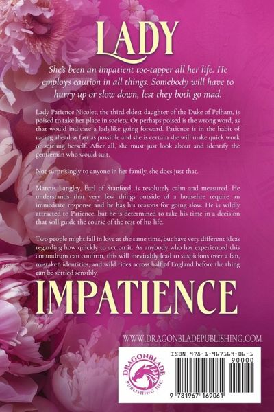 She's been an impatient toe-tapper all her life. He employs caution in all things. Somebody will have to hurry up or slow down, lest they both go mad. Lady Patience Nicolet, the third eldest daughter of the Duke of Pelham, is poised to take her place in society. Or perhaps poised is the wrong word, as that would indicate a ladylike going forward. Patience is in the habit of racing ahead as fast as possible and she is certain she will make quick work of settling herself. After all, she must just look about and identify the gentleman who would suit. Not surprisingly to anyone in her family, she does just that. Marcus Langley, Earl of Stanford, is resolutely calm and measured. He understands that very few things outside of a housefire require an immediate response and he has his reasons for going slow. He is wildly attracted to Patience, but he is determined to take his time in a decision that will guide the course of the rest of his life. Two people might fall in love at the same time, but have very different ideas regarding how quickly to act on it. As anybody who has experienced this conundrum can confirm, this will inevitably lead to suspicions over a fan, mistaken identities, and wild rides across half of England before the thing can be settled sensibly. Note: This series is part of Dragonblade's Sweet Dreams line, so this is a sweet, wholesome Historical Romance where passion beyond the bedroom door is left to the reader's imagination. A Series of Senseless Complications Book 1: Lady Ferocity Book 2: Lady Graceless Book 3: Lady Impatience Book 4: Lady Dramatic Book 5: Lady Liar Book 6: Lady Suspicious Book 7: Lady Fearful