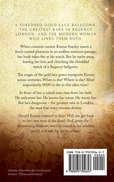 A shredded gold lace ballgown. The greatest rake in Regency London. And the modern woman who links them both. When costume curator Emma Stanley meets a frock-coated phantom in an endless museum passage, her body takes fire at his touch. But he melts away, leaving her lost, and clutching the shredded wreck of a Regency ballgown. The magic of the gold lace gown transports Emma across centuries. When is she? Where is she? Most importantly, WHO is she in this alien time? In front of her, a naked man rises from his bath. He welcomes her. He knows her name. He wants her. But he's dangerous - the greatest rake in London, the stud that every woman desires. Should Emma respond to him? Will she get back to her own time if she does? And, given the threatening shadows swirling round in her modern world, is it safe for her to return? First print edition of new Regency Timeslip by multi-published Harlequin Historical Romance author, Joanna Maitland. More information at https://libertabooks.com/joanna