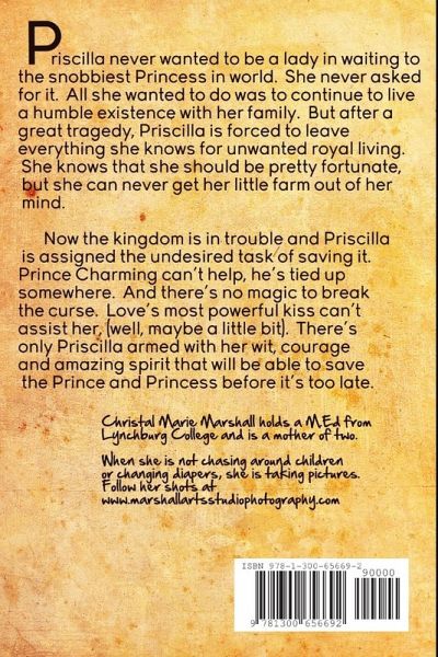 Priscilla never wanted to be a lady in waiting to the snobbiest Princess in world. She never asked for it. All she wanted to do was to continue to live a humble existence with her family. But after a great tragedy, Priscilla is forced to leave everything she knows for unwanted royal living. She knows that she should be pretty fortunate, but she can never get her little farm out of her mind. Now the kingdom is in trouble and Priscilla is assigned the undesired task of saving it. Prince Charming can't help, he's tied up somewhere. And there's no magic to break the curse. Love's most powerful kiss can't assist her, (well, maybe a little bit). There's only Priscilla armed with her wit, courage and amazing spirit that will be able to save the Prince and Princess before it's too late.