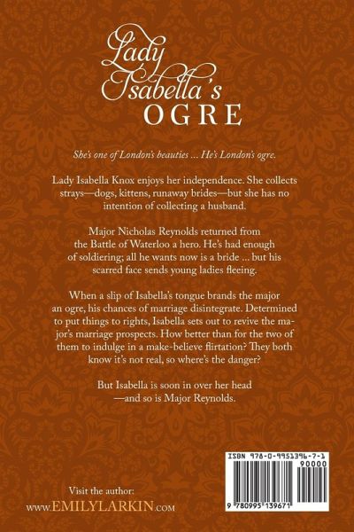 She's one of London's beauties ... he's London's ogre. Lady Isabella Knox enjoys her independence. She collects strays-dogs, kittens, runaway brides-but she has no intention of collecting a husband. Major Nicholas Reynolds returned from the Battle of Waterloo a hero. He's had enough of soldiering; all he wants now is a bride ... but his scarred face sends young ladies fleeing. When a slip of her tongue brands the major an ogre, his chances of marriage disintegrate. Determined to put things to rights, Isabella sets out to revive the major's marriage prospects. How better than for the two of them to indulge in a make-believe flirtation? They both know it's not real, so where's the danger? But Isabella is soon in over her head-and so is Major Reynolds. An entertaining and delightfully heartwarming Regency romance from award-winning and USA Today bestselling author Emily Larkin. Length: Full-length novel of 71,000 words Heat level: A Regency romance with a mildly sensual love scene If you love page-turning historical romances brimming with emotion, humor, and captivating characters, then this is the novel for you!