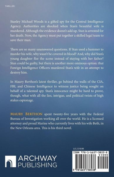 Stanley Michael Woods is a gifted spy for the Central Intelligence Agency. Authorities are shocked when Stan's beautiful wife is murdered. Although the evidence doesn't add up, Stan is arrested for her death. Now, the Agency must put together a skilled legal team to save their man. There are so many unanswered questions. If Stan used a hammer to murder his wife, why wasn't he covered in blood? And, why did Stan's young daughter flee the scene instead of staying with her father? Stan could be guilty, but there is another more ominous option: that Foreign Intelligence Officers murdered Stan's wife in an attempt to destroy him. In Maury Berthon's latest thriller, go behind the walls of the CIA, FBI, and Chinese Intelligence to witness justice being sought on behalf of a talented spy. Stan's innocence might be hard to prove, though, what with all the lies, intrigue, and political twists of high stakes espionage.