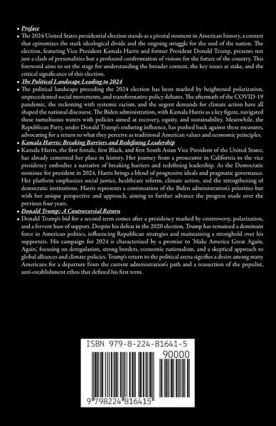 Preface The 2024 United States presidential election stands as a pivotal moment in American history, a contest that epitomizes the stark ideological divide and the ongoing struggle for the soul of the nation. The election, featuring Vice President Kamala Harris and former President Donald Trump, presents not just a clash of personalities but a profound confrontation of visions for the future of the country. This foreword aims to set the stage for understanding the broader context, the key issues at stake, and the critical significance of this election. The Political Landscape Leading to 2024 The political landscape preceding the 2024 election has been marked by heightened polarization, unprecedented social movements, and transformative policy debates. The aftermath of the COVID-19 pandemic, the reckoning with systemic racism, and the urgent demands for climate action have all shaped the national discourse. The Biden administration, with Kamala Harris as a key figure, navigated these tumultuous waters with policies aimed at recovery, equity, and sustainability. Meanwhile, the Republican Party, under Donald Trump's enduring influence, has pushed back against these measures, advocating for a return to what they perceive as traditional American values and economic principles. Kamala Harris: Breaking Barriers and Redefining Leadership Kamala Harris, the first female, first Black, and first South Asian Vice President of the United States, has already cemented her place in history. Her journey from a prosecutor in California to the vice presidency embodies a narrative of breaking barriers and redefining leadership. As the Democratic nominee for president in 2024, Harris brings a blend of progressive ideals and pragmatic governance. Her platform emphasizes social justice, healthcare reform, climate action, and the strengthening of democratic institutions. Harris represents a continuation of the Biden administration's priorities but with her unique perspective and approach, aiming to further advance the progress made over the previous four years. Donald Trump: A Controversial Return Donald Trump's bid for a second term comes after a presidency marked by controversy, polarization, and a fervent base of support. Despite his defeat in the 2020 election, Trump has remained a dominant force in American politics, influencing Republican strategies and maintaining a stronghold over his supporters. His campaign for 2024 is characterized by a promise to 'Make America Great Again, Again,' focusing on deregulation, strong borders, economic nationalism, and a skeptical approach to global alliances and climate policies. Trump's return to the political arena signifies a desire among many Americans for a departure from the current administration's path and a reassertion of the populist, anti-establishment ethos that defined his first term.