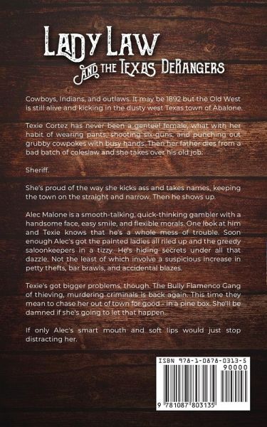Cowboys, Indians, and outlaws. It may be 1892 but the Old West is still alive and kicking in the dusty west Texas town of Abalone. When a bad batch of coleslaw kills Texie Cortez’s father she takes over his old job: Sheriff. She’s proud of how she keeps the gunslingers away and the cowpokes in order. Then HE comes to town. Gambler Alec Malone aims to attract attention with his handsome face and slick smile. One look at the sassy sheriff and his womanizing ways get the best of him. Too bad his mysterious mission keeps getting in the way. The appearance of an outlaw gang proves that Alec is just…mehr