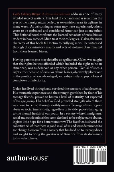 Lady Liberty Weeps: A dream disenchanted addresses one of many avoided subject matters. This land of enchantment as seen from the eyes of the immigrant, as perfect as we envision, rears its ugliness in many ways. As welcoming as some may have experienced, others yearn to be embraced and considered American just as any other. This fictional novel confronts the learned behaviors of racial bias as evident in how some children treat their colleagues. Galen, the main character of this book fell victim to bullying as will be witnessed through discriminatory insults and acts of violence disseminated from these learned biases. Having parents, one may describe as egalitarian, Galen was taught that the rights he was afforded which included the right to be an American, was as deserved as any other person. Denial of such a right either because of racial or ethnic biases, objectively places one in the position of less advantaged, and subjectively to psychological complexes of inferiority. Galen has lived through and survived the stressors of adolescence. His traumatic experience and the strength garnished by four of his teenage friends, proved to hasten a level of maturity not expected of his age group. His belief in God provided strength where there was none to be had through earthly means. Teenage adversity, peer abuse or social insensitivity, regardless of its title, proves damaging to the mental health of our youth. In a society where immigrants, racial and ethnic minorities seem destined to be subjected to abuses, it gives little hope for a better tomorrow. The five friends shared the collective belief that there is good in all of us and were determined to see change blossom from a society that has held on to its prejudices and sought to bring the greatness of America from its dormancy to its wakefulness.