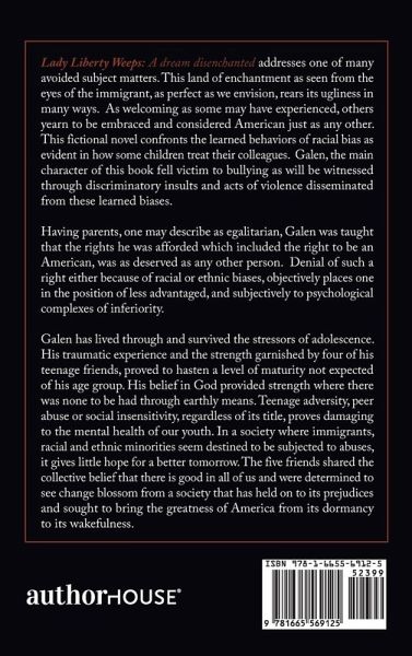 Lady Liberty Weeps: A dream disenchanted addresses one of many avoided subject matters. This land of enchantment as seen from the eyes of the immigrant, as perfect as we envision, rears its ugliness in many ways. As welcoming as some may have experienced, others yearn to be embraced and considered American just as any other. This fictional novel confronts the learned behaviors of racial bias as evident in how some children treat their colleagues. Galen, the main character of this book fell victim to bullying as will be witnessed through discriminatory insults and acts of violence disseminated from these learned biases. Having parents, one may describe as egalitarian, Galen was taught that the rights he was afforded which included the right to be an American, was as deserved as any other person. Denial of such a right either because of racial or ethnic biases, objectively places one in the position of less advantaged, and subjectively to psychological complexes of inferiority. Galen has lived through and survived the stressors of adolescence. His traumatic experience and the strength garnished by four of his teenage friends, proved to hasten a level of maturity not expected of his age group. His belief in God provided strength where there was none to be had through earthly means. Teenage adversity, peer abuse or social insensitivity, regardless of its title, proves damaging to the mental health of our youth. In a society where immigrants, racial and ethnic minorities seem destined to be subjected to abuses, it gives little hope for a better tomorrow. The five friends shared the collective belief that there is good in all of us and were determined to see change blossom from a society that has held on to its prejudices and sought to bring the greatness of America from its dormancy to its wakefulness.
