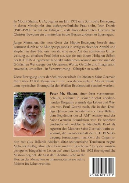 In Mount Shasta, USA, beginnt im Jahr 1972 eine Spirituelle Bewegung, in deren Mittelpunkt eine außergewöhnliche Frau steht, Pearl Dorris (1905-1990). Sie hat die Fähigkeit, kraft ihres erleuchteten Herzens das Christus-Bewusstsein unmittelbar in die Herzen anderer zu übertragen.Junge Menschen, die vom Geist der Hippie-Bewegung beseelt sind, kommen durch reine Mundpropaganda in stetig wachsender Anzahl und klopfen an ihre Tür, um von ihr eine neue Art der spirituellen Unterweisung zu erhalten; Pearl lehrt sie, wie sie mit ihrem Höheren Selbst, der ICH BIN-Gegenwart, Kontakt aufnehmen können und wie man die Göttlichen Werkzeuge der Gedanken, Worte, Gefühle und Imagination anwendet, um selbst - in Verantwortung - Schöpfer zu werden.Diese Bewegung unter der Schirmherrschaft des Meisters Saint Germain führt über 12.000 Menschen zu ihr, von denen viele in Mount Shasta, dem mystischen Brennpunkt der Weißen Bruderschaft sesshaft werden.Peter Mt. Shasta, einer ihrer vertrautesten Schüler, zeichnet in seiner höchst anerkennenden Biografie erstmals das Leben und Wirken von Pearl Dorris nach, die in den dreißiger Jahren eine Assistentin von Guy Ballard, dem Begründer der I AM-Activity und der Saint Germain Foundation war. Er berichtet eindrucksvoll, welche Schlüsselrolle Pearl als Agentin des Meisters Saint Germain darin zukommt, die Kernbotschaft der ICH BIN-Bewegung fortzutragen, nachdem die Organisation mit Guy Ballards Ableben elitär-sektiererische Tendenzen zeigte. Mehr als dreißig Jahre leben Pearl und ihr Beschützer Jerry ein zurückgezogenes bürgerliches Leben auf einer Ranch, bis 1972 ihre eigentliche Mission beginnt: die Saat der Christus-Liebe in die Herzen der Menschen zu pflanzen, damit sie wahre Meister im Leben werden.