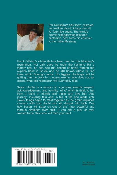 Frank O'Brian's whole life has been prep for this Mustang's restoration. Not only does he know the systems like a factory rep, he has had the benefit of being around the experts back in Korea and he still knows where to find them within Boeing's ranks. His biggest challenge will be getting them to work for a young woman who does not yet realize what this restoration will eventually take. Susan Hunter is a woman on a journey towards respect, acknowledgement and humility. All of which is dealt to her from a band of friends and those who love her. Any journey, including this one, is full of fits and starts until slowly things begin to meld together as the group replaces sarcasm with trust, doubt with aid, despair with faith. One day Susan will strap on one of the most powerful and famous airplanes ever built. If you are a pilot or ever wanted to be, this book will feed your soul.