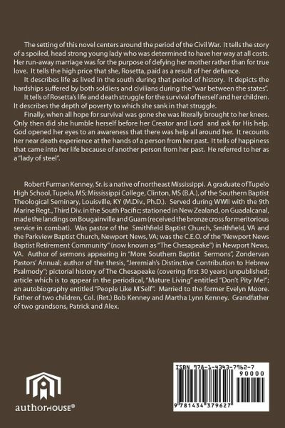 The setting of this novel centers around the period of the Civil War. It tells the story of a spoiled, head strong young lady who was determined to have her way at all costs. Her run-away marriage was for the purpose of defying her mother rather than for true love. It tells the high price that she, Rosetta, paid as a result of her defiance. It describes life as lived in the south during that period of history. It depicts the hardships suffered by both soldiers and civilians during the "war between the states". It tells of Rosetta's life and death struggle for the survival of herself and her children. It describes the depth of poverty to which she sank in that struggle. Finally, when all hope for survival was gone she was literally brought to her knees. Only then did she humble herself before her Creator and Lord and ask for His help. God opened her eyes to an awareness that there was help all around her. It recounts her near death experience at the hands of a person from her past. It tells of happiness that came into her life because of another person from her past. He referred to her as a "lady of steel".
