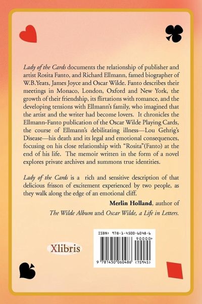 Lady of the Cards documents the relationship of publisher and artist Rosita Fanto, and Richard Ellmann, famed biographer of W.B.Yeats, James Joyce and Oscar Wilde. Fanto describes their meetings in Monaco, London, Oxford and New York, the growth of their friendship, its flirtations with romance, and the developing tensions with Ellmann's family, who imagined that the artist and the writer had become lovers. It chronicles the Ellmann-Fanto publication of the Oscar Wilde Playing Cards, the course of Ellmann's debilitating illness--Lou Gehrig's Disease-- his death and its legal and emotional consequences, focusing on his close relationship with "Rosita"(Fanto) at the end of his life. The memoir written in the form of a novel explores private archives and summons true identities. Intellectually and emotionally stimulating, Lady of the Cards is a sensitive and rich description of that delicious frisson of excitement which occurs between two people walking along the edge of an emotional cliff. Merlin Holland, author of The Wilde Album and Oscar Wilde, a Life in Letters