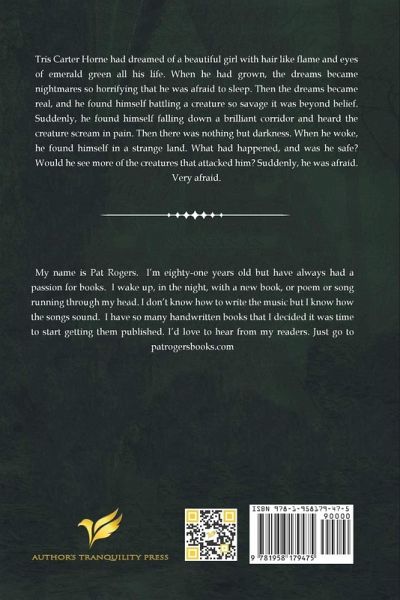 Tris Carter Horne had dreamed of a beautiful girl with hair like flame and eyes of emerald green all his life. When he had grown, the dreams became nightmares so horrifying that he was afraid to sleep. Then the dreams became real, and he found himself battling a creature so savage it was beyond belief. Suddenly, he found himself falling down a brilliant corridor and heard the creature scream in pain. Then there was nothing but darkness. When he woke, he found himself in a strange land. What had happened, and was he safe? Would he see more of the creatures that attacked him? Suddenly, he was afraid. Very afraid.