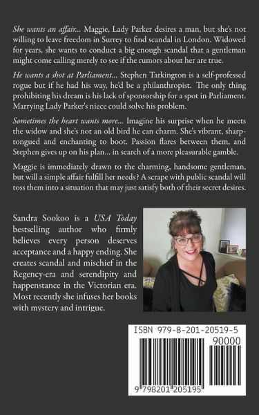 She wants an affair… Maggie, Lady Parker desires a man, but she's not willing to leave freedom in Surrey to find scandal in London. Widowed for years, she wants to conduct a big enough scandal that a gentleman might come calling merely to see if the rumors about her are true. He wants a shot at Parliament… Stephen Tarkington is a self-professed rogue but if he had his way, he'd be a philanthropist. The only thing prohibiting his dream is his lack of sponsorship for a spot in Parliament. Marrying Lady Parker's niece could solve his problem. Sometimes the heart wants more… Imagine his surprise when he meets the widow and she's not an old bird he can charm. She's vibrant, sharp-tongued and enchanting to boot. Passion flares between them, and Stephen gives up on his plan… in search of a more pleasurable gamble. Maggie is immediately drawn to the charming, handsome gentleman, but will a simple affair fulfill her needs? A scrape with public scandal will toss them into a situation that may just satisfy both of their secret desires.