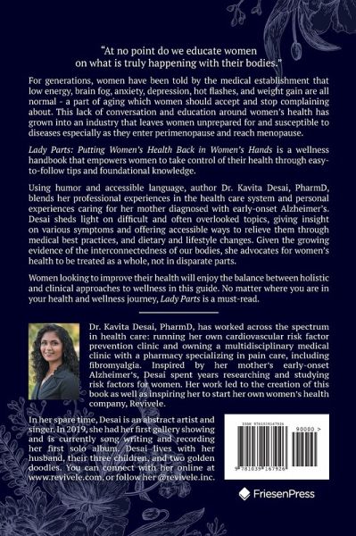 "At no point do we educate women on what is truly happening with their bodies." For generations, women have been told by the medical establishment that low energy, brain fog, anxiety, depression, hot flashes, and weight gain are all normal - a part of aging which women should accept and stop complaining about. This lack of conversation and education around women's health has grown into an industry that leaves women unprepared for and susceptible to diseases especially as they enter perimenopause and reach menopause. Lady Parts: Putting Women's Health Back in Women's Hands is a wellness handbook that empowers women to take control of their health through easy-to-follow tips and foundational knowledge. Using humor and accessible language, author Dr. Kavita Desai, PharmD, blends her professional experiences in the health care system and personal experiences caring for her mother diagnosed with early-onset Alzheimer's. Desai sheds light on difficult and often overlooked topics, giving insight on various symptoms and offering accessible ways to relieve them through medical best practices, and dietary and lifestyle changes. Given the growing evidence of the interconnectedness of our bodies, she advocates for women's health to be treated as a whole, not in disparate parts. Women looking to improve their health will enjoy the balance between holistic and clinical approaches to wellness in this guide. No matter where you are in your health and wellness journey, Lady Parts is a must-read.