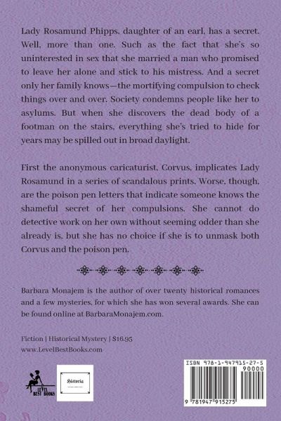 Lady Rosamund Phipps, daughter of an earl, has a secret. Well, more than one. Such as the fact that she's so uninterested in sex that she married a man who promised to leave her alone and stick to his mistress. And a secret only her family knows-the mortifying compulsion to check things over and over. Society condemns people like her to asylums. But when she discovers the dead body of a footman on the stairs, everything she's tried to hide for years may be spilled out in broad daylight. First the anonymous caricaturist, Corvus, implicates Lady Rosamund in a series of scandalous prints. Worse, though, are the poison pen letters that indicate someone knows the shameful secret of her compulsions. She cannot do detective work on her own without seeming odder than she already is, but she has no choice if she is to unmask both Corvus and the poison pen.