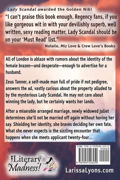 Sparks-and stockings-fly when an interview for a husband turns into a game of forfeits, and a scandalous lady and one handsome rogue learn how very right they are for each other. All of London is ablaze with rumors about the identity of the female brazen-and desperate-enough to advertise for a husband. Zeus Tanner, a self-made man full of pride if not pedigree, answers the ad, vastly curious about the property alluded to by the mysterious Lady Scandal. He may not care about winning the lady, but he certainly wants her lands. After a miserable arranged marriage, newly widowed Juliet determines she'll not be married off again without having her say. Shielding her identity, she braves deciding her own fate. What she never expects is the sizzling encounter that happens when she meets applicant twenty-four... Lady Scandal is a fun and super sexy Regency-styled Historical Romance written using period-appropriate slang (known as cant) and words common during the early 1800s. Zeus, Juliet (and Larissa, of course) bid you "Sparkish fine reading".