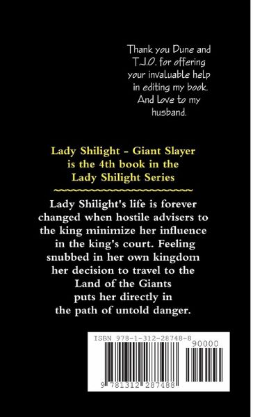 Lady Shilight - Giant Slayer is the 4th book in the Lady Shilight Series. Lady Shilight's life is forever changed when hostile advisers to the king minimize her influence in the king's court. Feeling snubbed in her own kingdom her decision to travel to the Land of the Giants puts her directly in the path of untold danger.