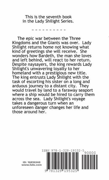 This is the seventh book in the Lady Shilight Series. * The epic war between the Three Kingdoms and the Giants is over. Lady Shilight returns home not knowing what kind of greetings she will receive. She wonders how Bardeth, the man she loves and left behind, will react to her return. Despite naysayers, the king rewards Lady Shilight's unwavering loyalty to her homeland with a prestigious new title. The king entrusts Lady Shilight with the task of escorting his sister on a long and arduous journey to a distant city. They will travel by land to a faraway seaport where a ship would then be hired to carry them across the sea. Lady Shilight's voyage takes a dangerous turn when an unforseen danger changes her life and those around her.