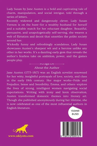 "Lady Susan by Jane Austen is a bold and captivating tale of charm, manipulation, and social intrigue, told through a series of letters. Recently widowed and dangerously clever, Lady Susan Vernon is on the hunt-for a wealthy husband for herself and a suitable match for her reluctant daughter. Beautiful, persuasive, and unapologetically self-serving, she weaves a web of flirtation and deceit that unsettles the polite society around her. Wickedly funny and refreshingly scandalous, Lady Susan showcases Austen's sharpest wit and a heroine unlike any other in her works. It's a dazzling early gem that reveals the author's fearless take on ambition, power, and the games people play."