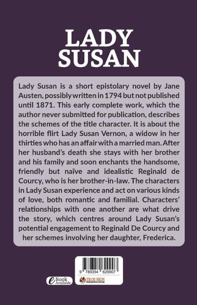 Lady Susan is a short epistolary novel by Jane Austen, possibly written in 1794 but not published until 1871. This early complete work, which the author never submitted for publication, describes the schemes of the title character. It is about the horrible flirt Lady Susan Vernon, a widow in her thirties who has an affair with a married man. After her husband's death she stays with her brother and his family and soon enchants the handsome, friendly but naïve and idealistic Reginald de Courcy, who is her brother-in-law. The characters in Lady Susan experience and act on various kinds of love, both romantic and familial. Characters' relationships with one another are what drive the story, which centres around Lady Susan's potential engagement to Reginald De Courcy and her schemes involving her daughter, Frederica.
