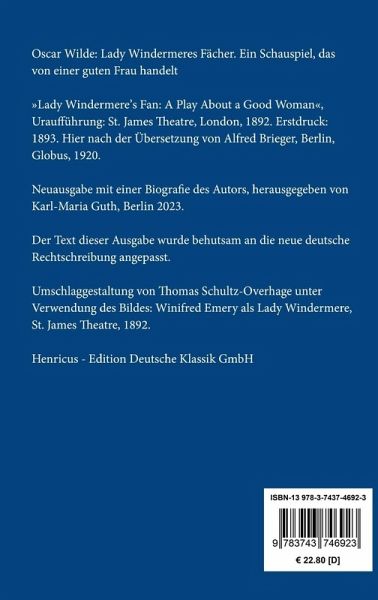 Oscar Wilde: Lady Windermeres Fächer. Ein Schauspiel, das von einer guten Frau handelt »Lady Windermere's Fan: A Play About a Good Woman«, Uraufführung: St. James Theatre, London, 1892. Erstdruck: 1893. Hier nach der Übersetzung von Alfred Brieger, Berlin, Globus, 1920. Neuausgabe mit einer Biografie des Autors. Herausgegeben von Karl-Maria Guth. Berlin 2023. Der Text dieser Ausgabe wurde behutsam an die neue deutsche Rechtschreibung angepasst. Umschlaggestaltung von Thomas Schultz-Overhage unter Verwendung des Bildes: Winifred Emery als Lady Windermere, St. James Theatre, 1892. Gesetzt aus der Minion Pro, 11 pt. Henricus - Edition Deutsche Klassik GmbH Über den Autor: 1854 in Dublin als zweites von drei Kindern eines bekannten Augenarztes und einer Schriftstellerin geboren, lässt sich Oscar Fingal O'Flahertie Wills Wilde nach dem Literaturstudium in Dublin und Oxford in London nieder. Der schlagfertig humorvolle Freimaurer entwickelt sich zu einem berühmt berüchtigten Skandalautor, genießt seinen schlechten Ruf als Dandy und pflegt einen extravaganten Auftritt in samtenen Kniebundhosen mit Seidenstrümpfen. Er wird gehässig karikiert und zugleich für seine Bonmots gefeiert. 30-jährig heiratet der inzwischen weltberühmte Dichter die wohlhabende und bildschöne Kinderautorin Constance Mary Loyd, mit der er zwei Söhne haben wird. 1895 zettelt der Vater seines langjährigen Liebhabers Lord Alfred Douglas einen Prozess wegen der damals schwer bestraften Homosexualität gegen ihn an, der ihn für zwei Jahre ins Zuchthaus bringt. Die menschenverachtenden Haftbedingungen in Isolation und Dunkelheit mit harter Zwangsarbeit ruinieren seine Gesundheit. Nach seiner Entlassung lebt er verarmt, vereinsamt und krank in Paris. Am 30. November 1900 stirbt mit Oscar Wilde ein charismatischer Repräsentant der Dekadenz und eine der schillerndsten Figuren des viktorianischen Englands. 1917 schreibt Alfred Kerr über Oscar Wilde »Seine langsame Hinrichtung bleibt der letzte Akt des Mittelalters.«