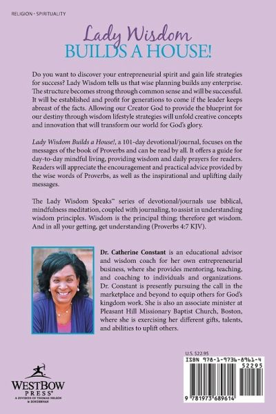 Do you want to discover your entrepreneurial spirit and gain life strategies for success? Lady Wisdom tells us that wise planning builds any enterprise. The structure becomes strong through common sense and will be successful. It will be established and profit for generations to come if the leader keeps abreast of the facts. Allowing our Creator God to provide the blueprint for our destiny through wisdom lifestyle strategies will unfold creative concepts and innovation that will transform our world for God's glory. Lady Wisdom Builds a House!, a 101-day devotional/journal, focuses on the messages of the book of Proverbs and can be read by all. It offers a guide for day-to-day mindful living, providing wisdom and daily prayers for readers. Readers will appreciate the encouragement and practical advice provided by the wise words of Proverbs, as well as the inspirational and uplifting daily messages. The Lady Wisdom Speaks series of devotional/journals use biblical, mindfulness meditation, coupled with journaling, to assist in understanding wisdom principles. Wisdom is the principal thing; therefore get wisdom. And in all your getting, get understanding (Proverbs 4:7 KJV).