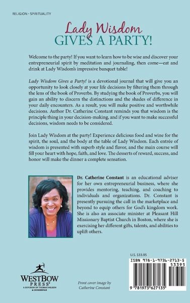 Welcome to the party! If you want to learn how to be wise and discover your entrepreneurial spirit by meditation and journaling, then comeeat and drink at Lady Wisdoms impressive banquet table! Lady Wisdom Gives a Party! is a devotional journal that will give you an opportunity to look closely at your life decisions by filtering them through the lens of the book of Proverbs. By studying the book of Proverbs, you will gain an ability to discern the distinctions and the shades of difference in your daily encounters. As a result, you will make positive and worthwhile decisions. Author Dr. Catherine Constant reminds you that wisdom is the principle thing in your decision-making, and if you want to make successful decisions, wisdom needs to be considered. Join Lady Wisdom at the party! Experience delicious food and wine for the spirit, the soul, and the body at the table of Lady Wisdom. Each entre of wisdom is presented with superb style and flavor, and the main course will fill your heart with hope, faith, and love. The desserts of reward, success, and honor will make the dinner a complete sensation.