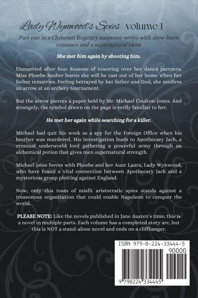 Pride and Prejudice meets Mission: Impossible Part one in a Christian Regency suspense series with slow-burn romance and a supernatural twist Large Print Edition She met him again by shooting him. Unmarried after four Seasons of towering over her dance partners, Miss Phoebe Sauber learns she will be cast out of her home when her father remarries. Feeling betrayed by her father and God, she misfires an arrow at an archery tournament. But the arrow pierces a paper held by Mr. Michael Coulton-Jones. And strangely, the symbol drawn on the page is eerily familiar to her. He met her again while searching for a killer. Michael had quit his work as a spy for the Foreign Office when his brother was murdered. His investigation leads to Apothecary Jack, a criminal underworld lord gathering a powerful army through an alchemical potion that gives men supernatural strength. Michael joins forces with Phoebe and her Aunt Laura, Lady Wynwood, who have found a vital connection between Apothecary Jack and a mysterious group plotting against England. Now, only this team of misfit aristocratic spies stands against a treasonous organization that could enable Napoleon to conquer the world. PLEASE NOTE: Like the novels published in Jane Austen's time, this is a novel in multiple parts. Each volume has a completed story arc, but this is NOT a stand-alone novel and ends on a cliffhanger.