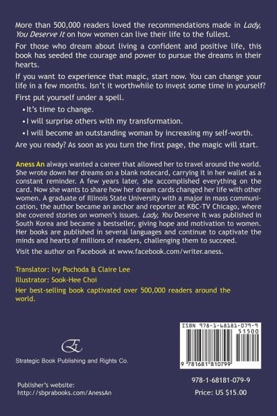 More than 500,000 readers loved the recommendations made in Lady, You Deserve It on how women can live their life to the fullest.For those who dream about living a confident and positive life, this book has seeded the courage and power to pursue the dreams in their hearts. If you want to experience that magic, start now. You can change your life in a few months. Isn't it worthwhile to invest some time in yourself?First put yourself under a spell.¿It's time to change.¿I will surprise others with my transformation.¿I will become an outstanding woman by increasing my self-worth.Are you ready? As soon as you turn the first page, the magic will start. Aness An always wanted a career that allowed her to travel around the world. She wrote down her dreams on a blank notecard, carrying it in her wallet as a constant reminder. A few years later, she accomplished everything on the card. Now she wants to share how her dream cards changed her life with other women. A graduate of Illinois State University with a major in mass communication, the author became an anchor and reporter at KBC-TV Chicago, where she covered stories on women's issues. Lady, You Deserve It was published in South Korea and became a bestseller, giving hope and motivation to women. Her books are published in several languages and continue to captivate the minds and hearts of millions of readers, challenging them to succeed.Visit the author on Facebook at www.facebook.com/writer.aness. Publisher's website: http://sbprabooks.com/AnessAn