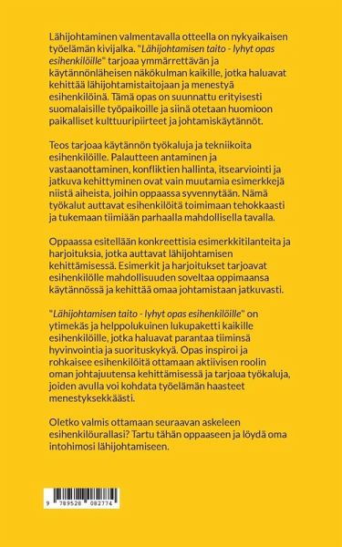 Lähijohtaminen valmentavalla otteella on nykyaikaisen työelämän kivijalka. "Lähijohtamisen taito - lyhyt opas esihenkilöille" tarjoaa ymmärrettävän ja käytännönläheisen näkökulman kaikille, jotka haluavat kehittää lähijohtamistaitojaan ja menestyä esihenkilöinä. Tämä opas on suunnattu erityisesti suomalaisille työpaikoille ja siinä otetaan huomioon paikalliset kulttuuripiirteet ja johtamiskäytännöt. Opas alkaa lähijohtamisen määrittelyllä, ja perustelut siihen, miksi se on tärkeää. Tästä edetään esihenkilön rooliin ja vastuisiin sekä siihen, miten lähijohtaminen eroaa muista johtamistehtävistä. Lukija saa selkeän käsityksen siitä, millaista osaamista ja ominaisuuksia hyvä lähijohtaja tarvitsee. Yksi oppaan keskeisistä teemoista on valmentava johtaminen. Tämä johtamistyyli korostaa esihenkilön roolia mentorina ja ohjaajana, joka auttaa työntekijöitä kehittymään ja saavuttamaan omat tavoitteensa. Opas tarjoaa konkreettisia esimerkkejä ja periaatteita, joiden avulla valmentavaa johtamista voi soveltaa käytännössä. Teos tarjoaa myös käytännön työkaluja ja tekniikoita esihenkilöille. Palautteen antaminen ja vastaanottaminen, konfliktien hallinta, itsearviointi ja jatkuva kehittyminen ovat vain muutamia esimerkkejä niistä aiheista, joihin oppaassa syvennytään. Nämä työkalut auttavat esihenkilöitä toimimaan tehokkaasti ja tukemaan tiimiään parhaalla mahdollisella tavalla. Oppaassa esitellään konkreettisia esimerkkitilanteita ja harjoituksia, jotka auttavat lähijohtamisen kehittämisessä. Esimerkit ja harjoitukset tarjoavat esihenkilölle mahdollisuuden soveltaa oppimaansa käytännössä ja kehittää omaa johtamistaan jatkuvasti. "Lähijohtamisen taito - lyhyt opas esihenkilöille" on ytimekäs ja helppolukuinen lukupaketti kaikille esihenkilöille, jotka haluavat parantaa tiiminsä hyvinvointia ja suorituskykyä. Opas inspiroi ja rohkaisee esihenkilöitä ottamaan aktiivisen roolin oman johtajuutensa kehittämisessä ja tarjoaa työkaluja, joiden avulla voi kohdata työelämän haasteet menestyksekkäästi. Oletko valmis ottamaan seuraavan askeleen esihenkilöurallasi? Tartu tähän oppaaseen ja löydä oma intohimosi lähijohtamiseen.