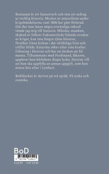 Romanen är ett fantasiverk och inte ett utdrag ur verklig historia. Mycket av atmosfären under krigshändelserna runt 1806 har gått förlorad. Där det inte fanns några trovärdiga rekord vände jag mig till fantasin. Nikolas, munken, skakad av folkets fruktansvärda lidande orsakat av kriget, kan inte längre tjäna klostret, försöker finna lyckan i det världsliga livet och träffar Hilde. Katarina söker efter sina krafter frälsning i klostret och har en önskan att bli nunna. Tillsammans med Ferdinand, läkaren, upplever hon kärlekens djupa lycka. Destiny vill att hon ska uppfylla en annan uppgift, som hon måste leta efter i Lynhart.Bokblocket är skrivet på två språk. På tyska och svenska.