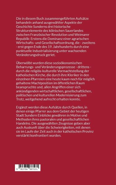 Die in diesem Buch zusammengeführten Aufsätze behandeln anhand ausgewählter Aspekte der Geschichte Sunderns drei historische Strukturelemente des kölnischen Sauerlandes zwischen Französischer Revolution und Weimarer Republik: Erstens die Dominanz einer agrarischen Wirtschafts- und Gesellschaftsordnung, die - zweitens - erst gegen Ende des 19. Jahrhunderts durch eine punktuelle Industrialisierung unter wachsenden Veränderungsdruck geriet.Überwölbt wurden diese sozioökonomischen Beharrungs- und Veränderungsprozesse - drittens - durch die religiös-kulturelle Vormachtstellung der katholischen Kirche, die durch ihre Kleriker in den einzelnen Pfarreien eine heute kaum noch für möglich gehaltene Machtposition im öffentlichen Raum beanspruchte und, allen Angriffen einer sich ankündigenden wirtschaftlichen, gesellschaftlichen, politischen und kulturellen Modernisierung zum Trotz, weitgehend aufrecht erhalten konnte.Ergänzt werden diese Aufsätze durch Quellen, in denen einige Pfarrer aus dem Gebiet der heutigen Stadt Sundern Einblicke gewähren in Motive und Methoden ihres pastoralen und gesellschaftlichen Handelns. Die ausgewählten Zeugnisse geben aber auch Auskunft über die Schwierigkeiten, mit denen sie im Laufe der Zeit auch in der katholischen Provinz verstärkt konfrontiert wurden.